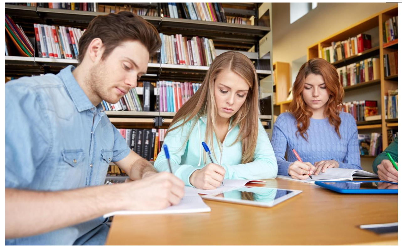 It shows some people studying together in a library.