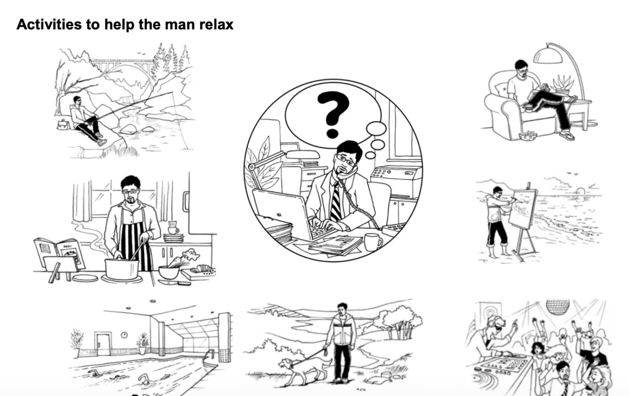 Talk together about the different activities he could do, and say which would be most relaxing.