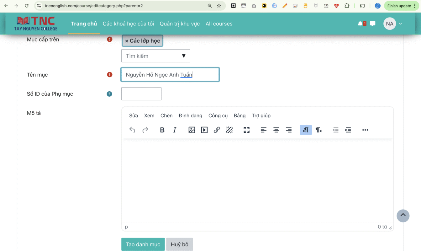 Nhập tên giáo viên ở ô “Tên mục” và nhấn “Tạo danh mục để lưu”